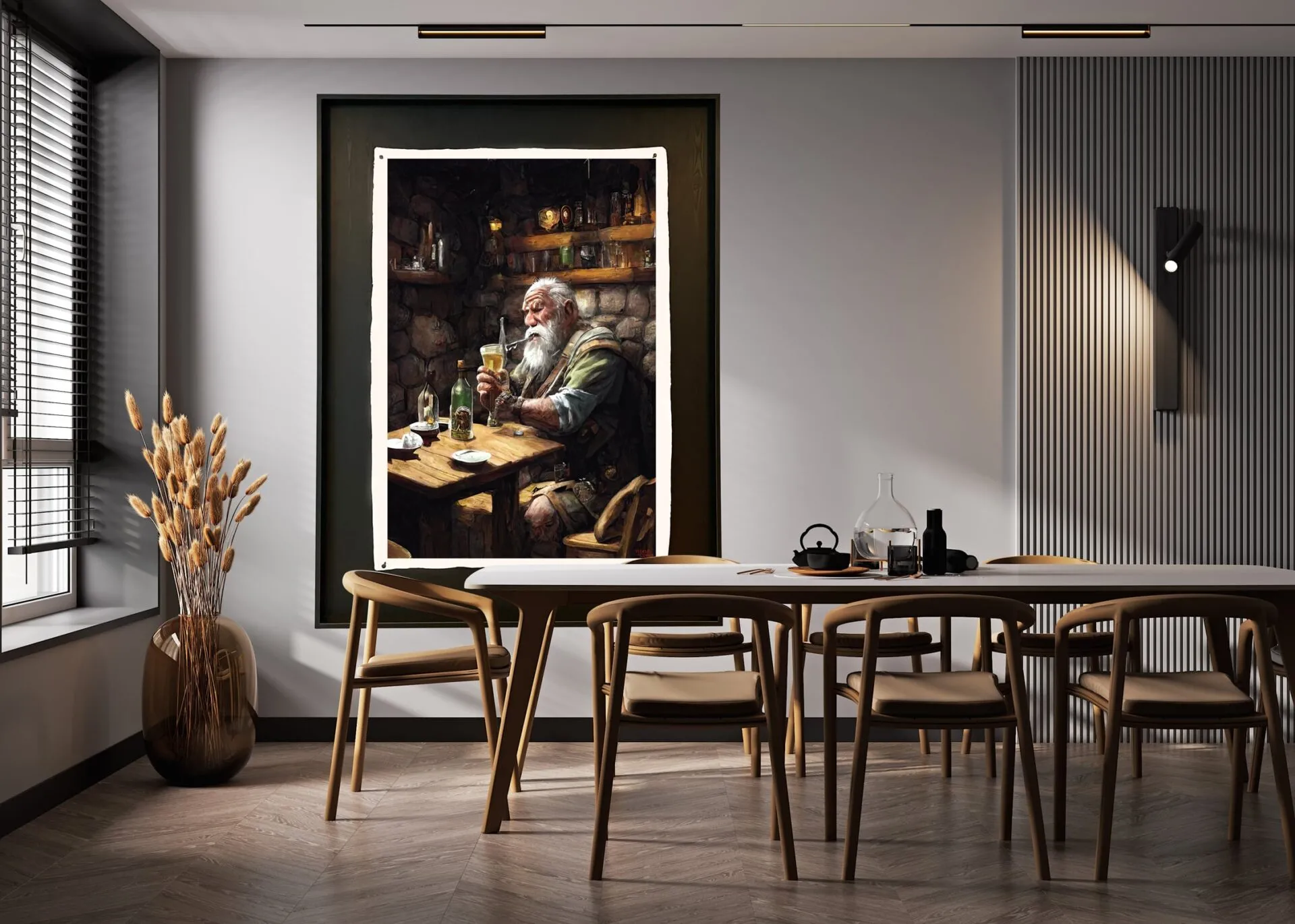 Dieses Kunstwerk strahlt eine traditionelle Atmosphäre aus, wobei der alte Mann der Hüter des Erbes und der Freuden der Region zu sein scheint. Die Details und die Stimmung rufen ein Gefühl von Nostalgie und Respekt für Tradition und Genuss hervor.