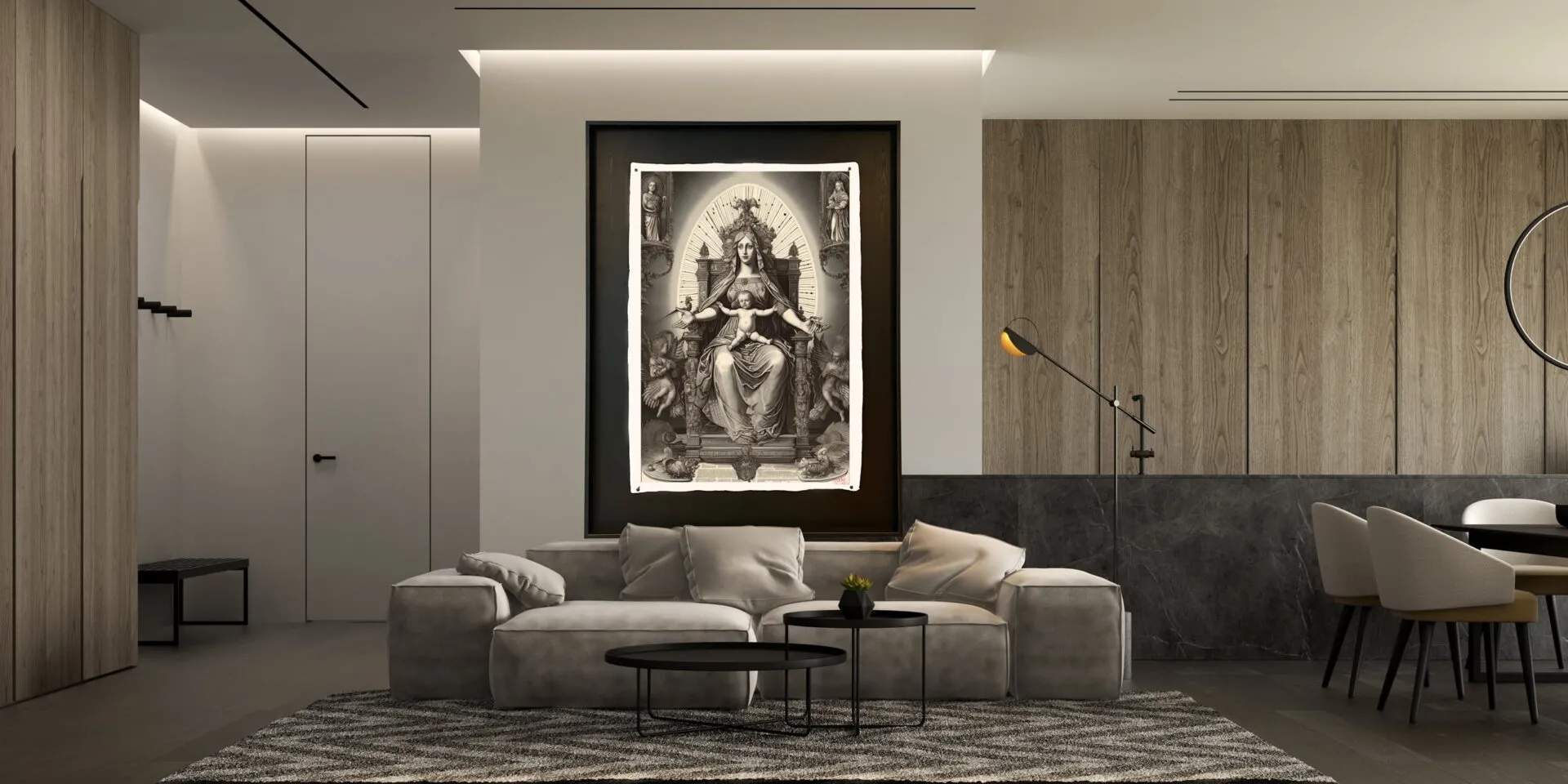 Dieser Druck zeigt eine Szene der Madonna, der Mutter Maria, die auf einem wunderschönen hölzernen Thron sitzt, verziert mit kunstvoll geschnitzten Verzierungen. Die Komposition strahlt eine Atmosphäre göttlichen Friedens und Gelassenheit aus, mit exquisiten Details und dem strahlenden Licht, das ein Gefühl von Spiritualität und Präsenz betont.