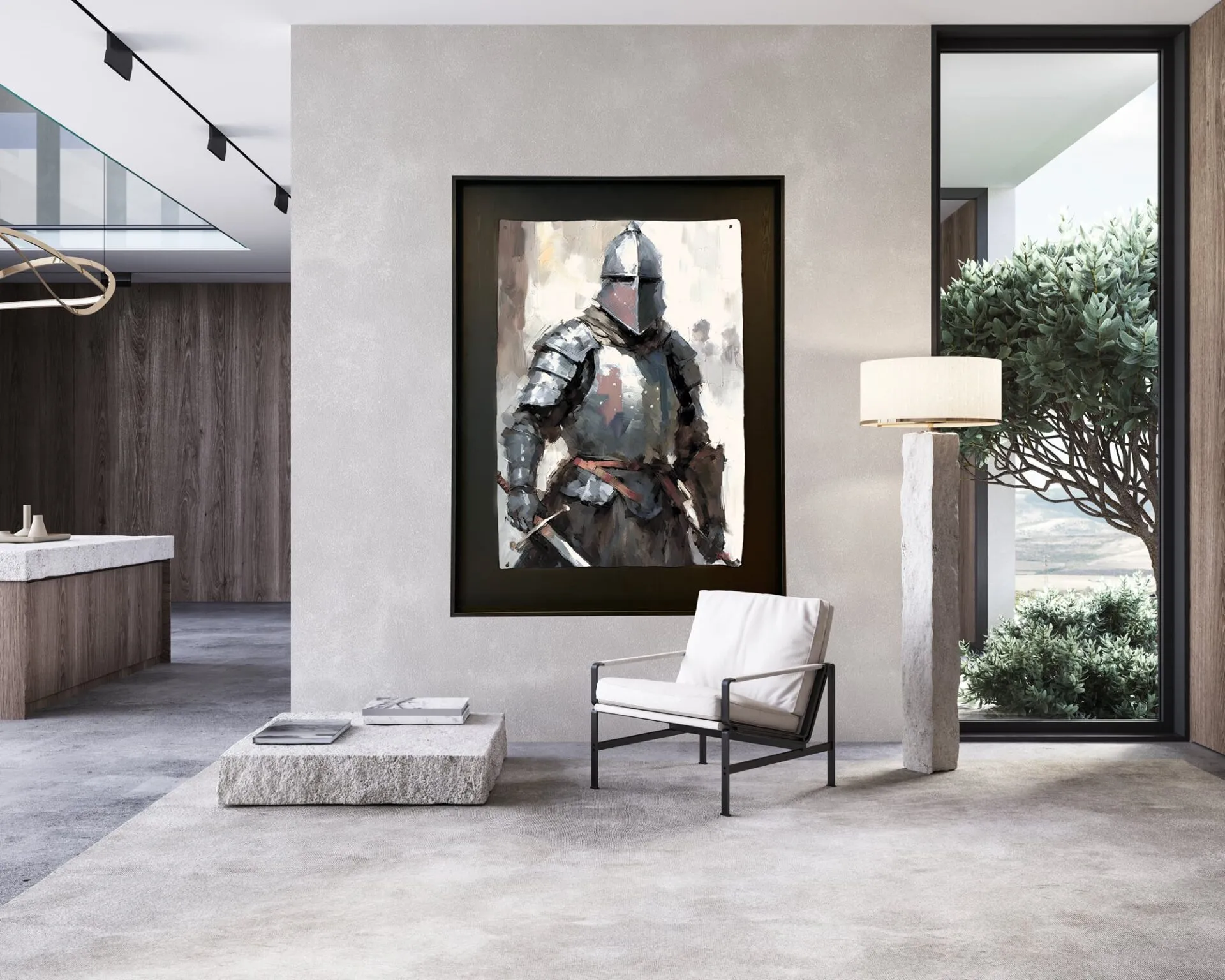 Dieses Gemälde zeigt eine detaillierte Nahaufnahme eines Gladiators, der vollständig auf den Kampf vorbereitet ist. Die Farbpalette und die Fokussierung auf den Gladiator bieten einen intimeren Einblick in seine Entschlossenheit und den bevorstehenden Kampf.