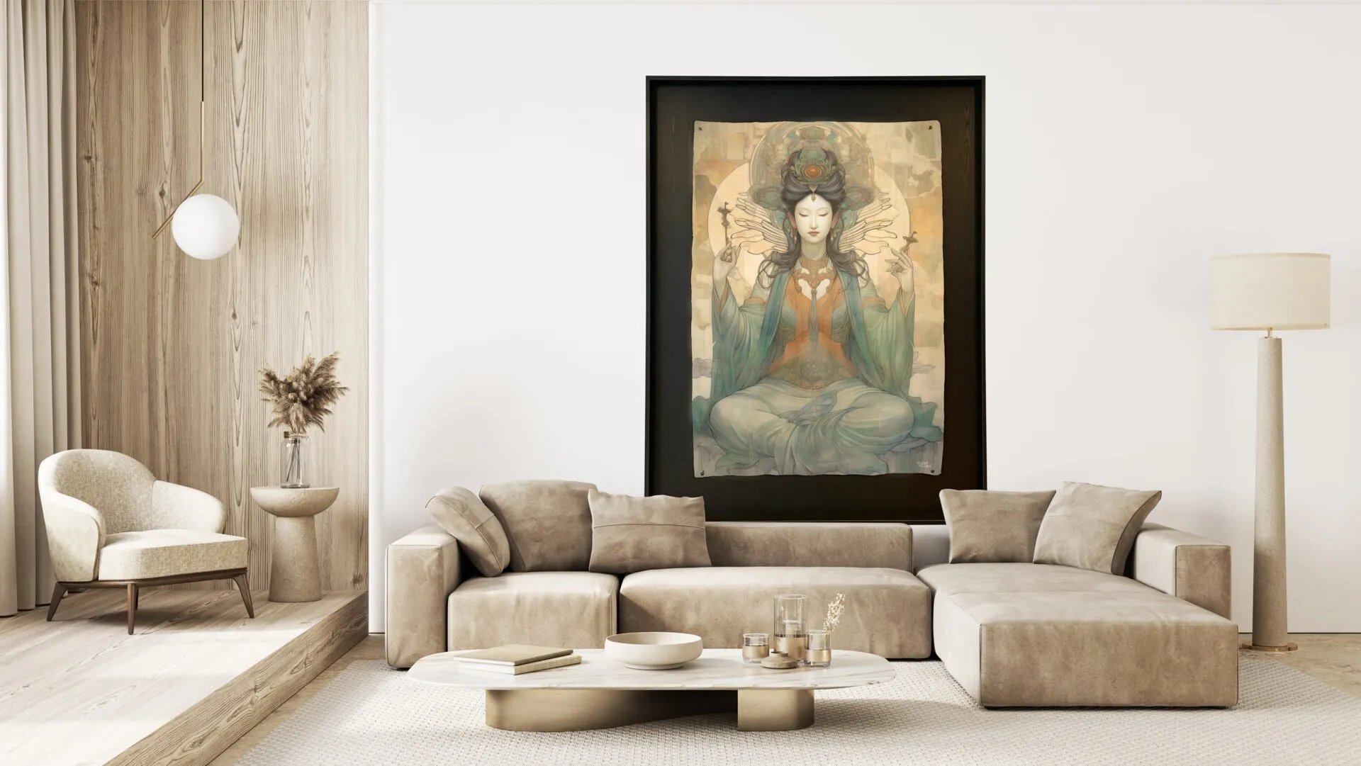 Die Farbpalette aus Hellblau, Gelb und Rot ruft ein Gefühl von spiritueller Harmonie und Ausgeglichenheit hervor. Das Hellblau symbolisiert Ruhe und Klarheit, das Gelb strahlt Weisheit und Einsicht aus, und das Rot repräsentiert Energie und Leidenschaft, zusammen eine visuelle Ausgewogenheit schaffend. Dieses Kunstwerk lädt zur inneren Reflexion ein und dazu, die meditative Tiefe der Haltung der Frau zu erleben.
