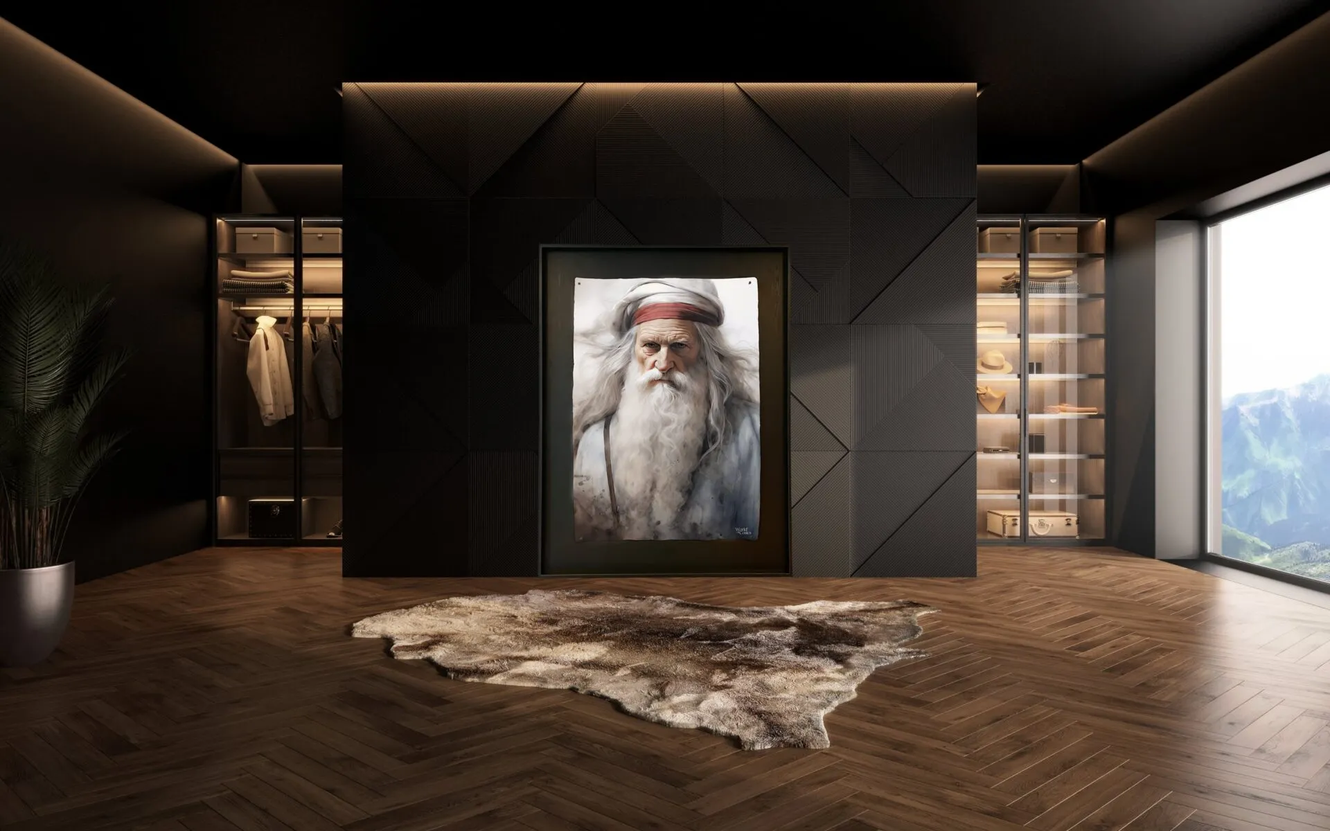 Der Druck zeigt einen alten Mann mit einem üppigen Bart, der seine weise Ausstrahlung betont. Sein durchdringender Blick strahlt sowohl Mysterium als auch Weisheit aus und erzeugt ein Gefühl eines zeitlosen und bezaubernden Charakters. Die Kombination aus seinem charakteristischen Erscheinungsbild und faszinierenden Ausdruck schafft ein fesselndes Bild, das die Vorstellungskraft anregt.