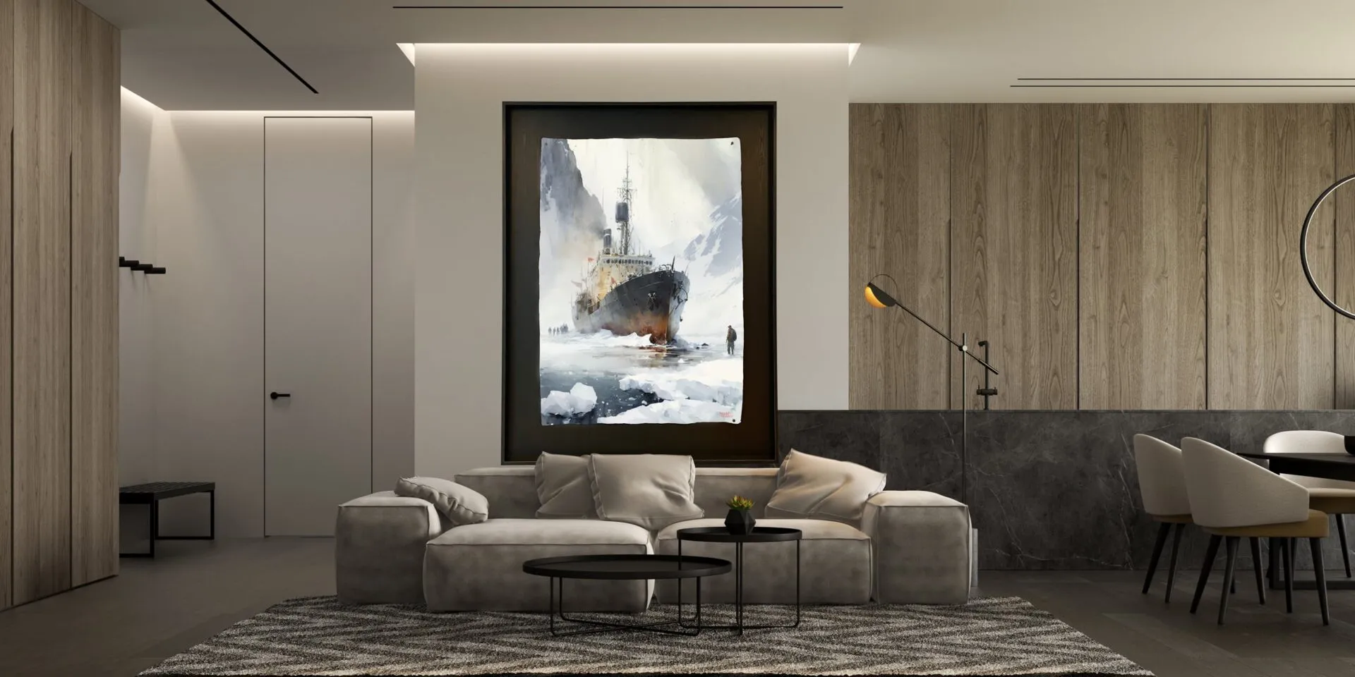 This masterful print takes the viewer on an unforgettable journey to the frozen wilderness of the Far North. In the foreground, a majestic ship stands, its imposing hull appearing to break through the ice. The ship hovers among ice floes, determined to navigate its way through the cold waters, while the icy atmosphere and enchanting beauty of the Arctic region permeate the scene.