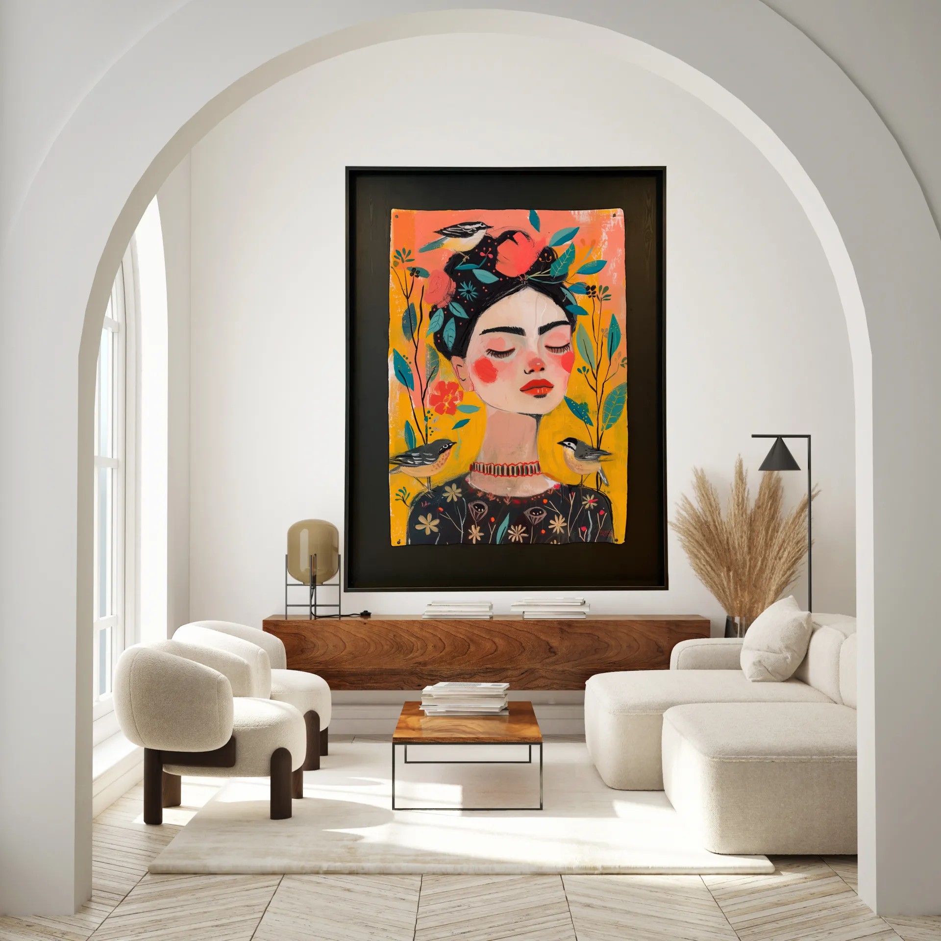 A beautiful colorful artwork that not only exudes peace and calmness but also warmth and joy. It’s fantastic to incorporate this artwork into an interior with natural tones, where Miss Serene truly stands out on the wall.